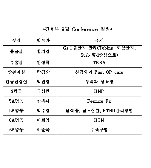<9月> 간호부 conference 일정 페이지 정보 작성자 관리자 작성일09-08-31 15:37 조회34,431회 댓글0건 관련링크 이전글 다음글 목록 본문 .. 댓글목록 등록된 댓글이 없습니다. 이전글 다음글 목록