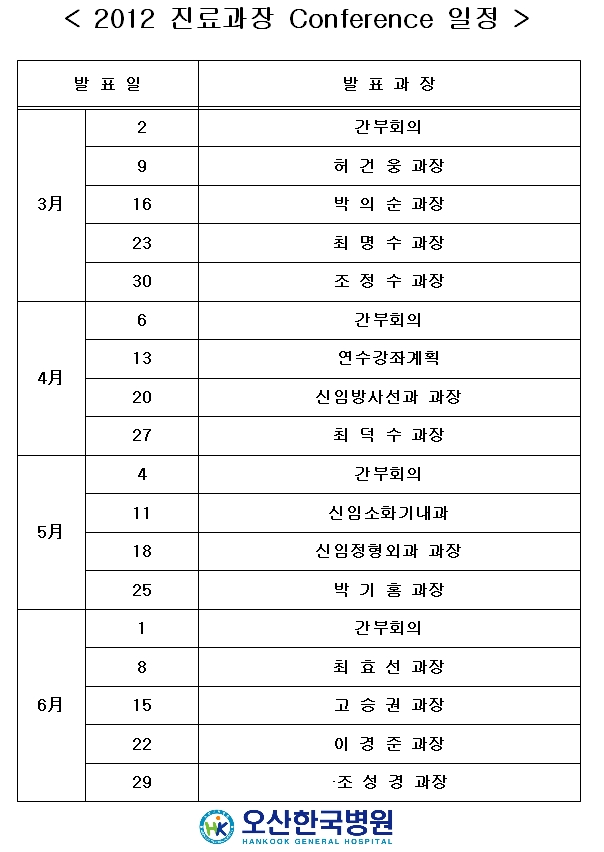 2012년 진료과장 상반기 conference 일정 페이지 정보 작성자 관리자 작성일12-02-15 09:29 조회36,014회 댓글0건 관련링크 이전글 다음글 목록 본문 오산한국병원 댓글목록 등록된 댓글이 없습니다. 이전글 다음글 목록