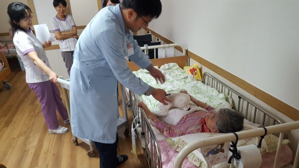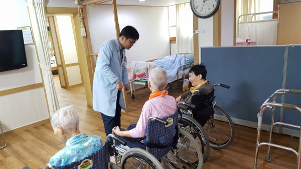 가정의학과 신정호 부장이 진료 및 상담을 하였으며 간호사와 사회복지사가 봉사활동에 동참하였습니다. 요양기관에 거주하고 계시는 거동이 불편하신 노인분들을 뵙고 한 분씩 개인별로 상담을 하고 진료하는 형식으로 진행하였습니다.
