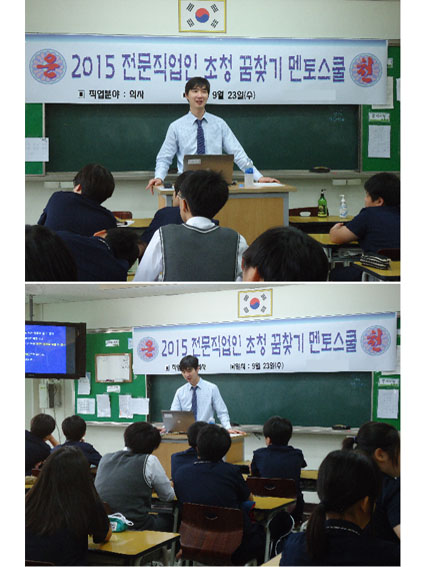 2015년 9 월 23일 (수) 가정의학과 전공의 조현원선생님께서 운천중학교를 방문하여 멘토링 강의를 진행하여주셨습니다.