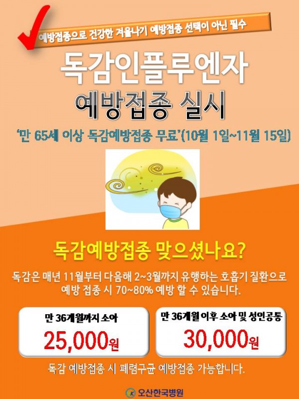 현재 본원에서는 독감 일반예방접종과 무료예방접종을 실시(10월1일~11월 15일)하고 있습니다.