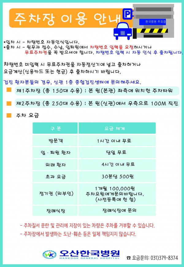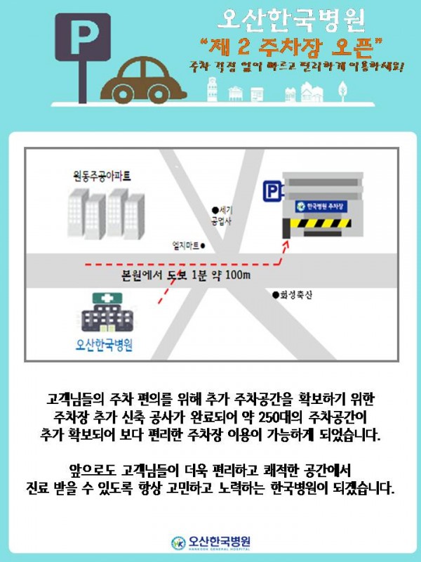 오산한국병원 제 2주차장 오픈 페이지 정보 작성자 오산한국병원 작성일15-10-05 15:37 조회56,213회 댓글0건 관련링크 이전글 다음글 목록 본문 주차장 이용안내를 참고하시어 이용하시는데 불편함 없으시길 바랍니다. 댓글목록 등록된 댓글이 없습니다. 이전글 다음글 목록