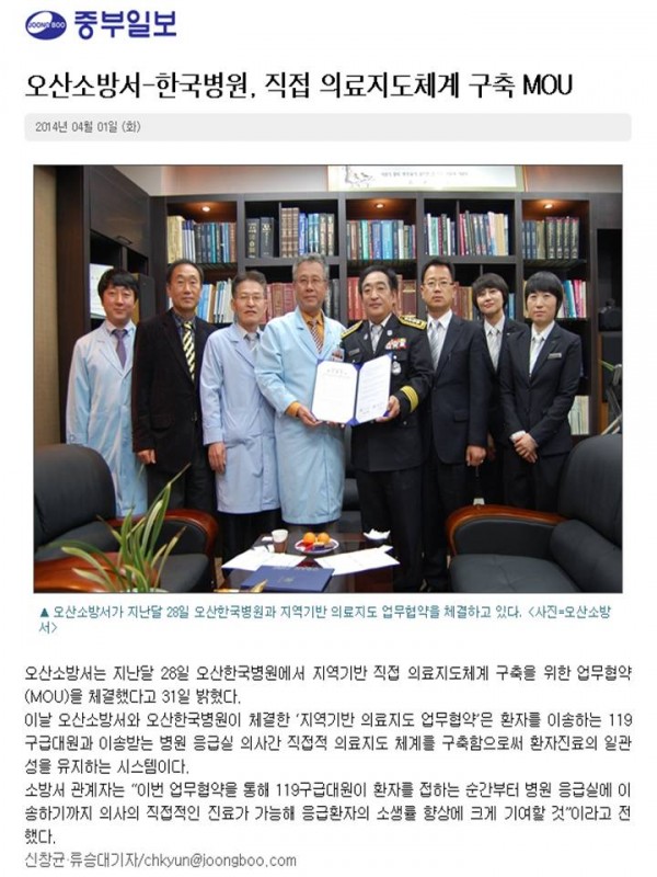 환자를 인계받을 의사가 직접 의료지도를 실시하여 환자에 대한 사전 정보파악으로 즉각적인 응급진료 대비를 가능하도록 하기 위한 ‘지역기반 직접의료지도체계 구축’을 목표로 2014년 3월 28일 본원에서 ‘오산 소방서’와 ‘오산한국병원(이하 본원)’이 의료지도 업무협약(MOU)을 체결하였습니다.