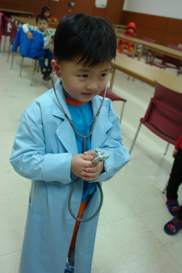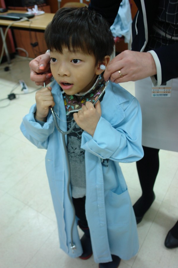 청진기와 의사 가운을 입고 의사체험을 해보았습니다.