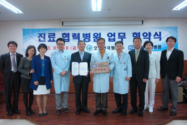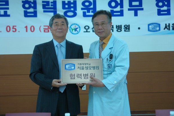 오산한국병원 조한호 병원장, 서울성모병원 전후근 암병원장 및 대외협력부원장과 병원의 주요 간부들이 참석한 가운데 치러진 체결식에서 양측은 의학교육, 진료, 연구 및 의료기술지원을 상호협력함으로써 지역사회의 균형적인 의료발전을 도모하기로 하였습니다.