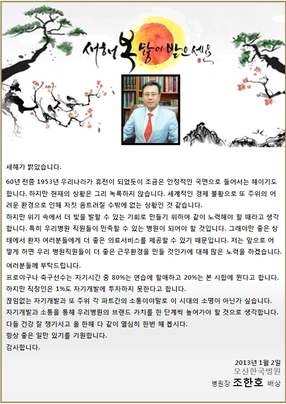 2013년 신년사 페이지 정보 작성자 관리자 작성일13-01-02 16:59 조회49,198회 댓글0건 관련링크 이전글 다음글 목록 본문 댓글목록 등록된 댓글이 없습니다. 이전글 다음글 목록