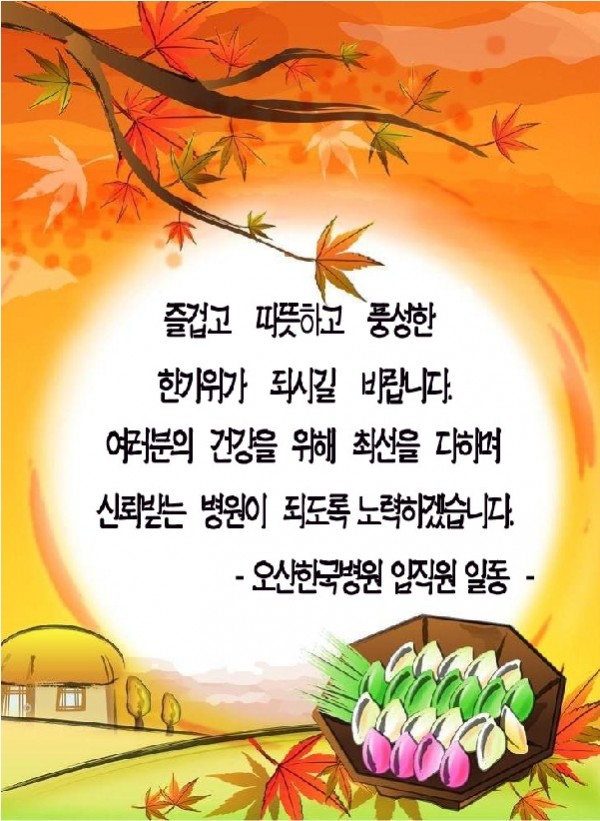 즐거운 한가위 되세요~ 페이지 정보 작성자 관리자 작성일10-09-17 10:52 조회45,759회 댓글0건 관련링크 이전글 다음글 목록 본문 우리 병원을 이용해주신 모든 분께 감사 드리며 앞으로도 고객의 소리에 귀기울이는 병원이 되겠습니다. 즐거운 한가위를 보내시길 바랍니다. 댓글목록 등록된 댓글이 없습니다. 이전글 다음글 목록