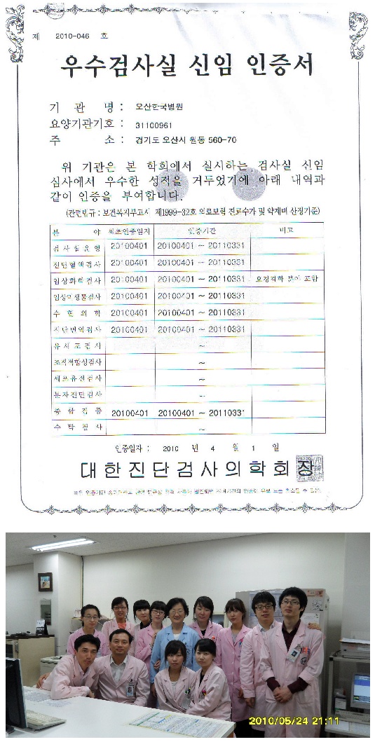 오산한국병원 진단검사의학과 ‘우수검사실 신임 인증서’를 4월17일 획득했다.