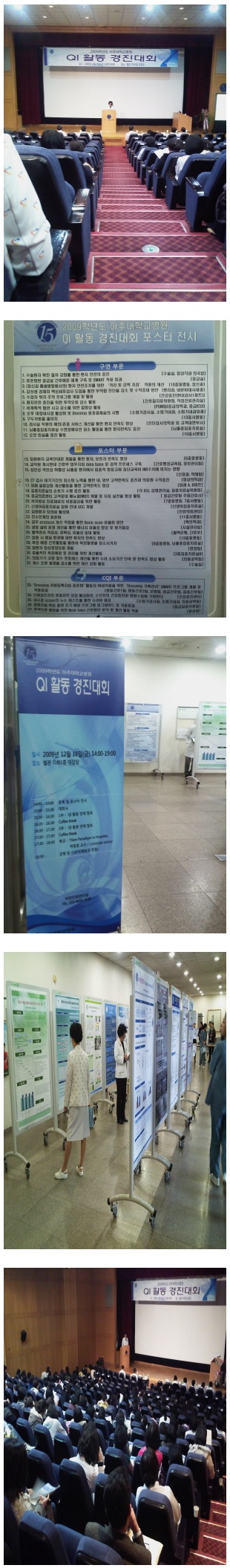 5) 내 용: 총 60여개의 QI활동 위원회를 가진 아주대학교 병원에서는 이번 경진대회를 총 3부문으로 나누고, 09년 한해동안 열심히 활동하면서 모아진 모든 QI위원회의 활동자료들중에서 우수한 내용들을 모아 구연부문(12개부서),포스터부문(20개부서),CQI부문(5개부서)을 최종심사하여 평가하는 형식으로 진행되었습니다.