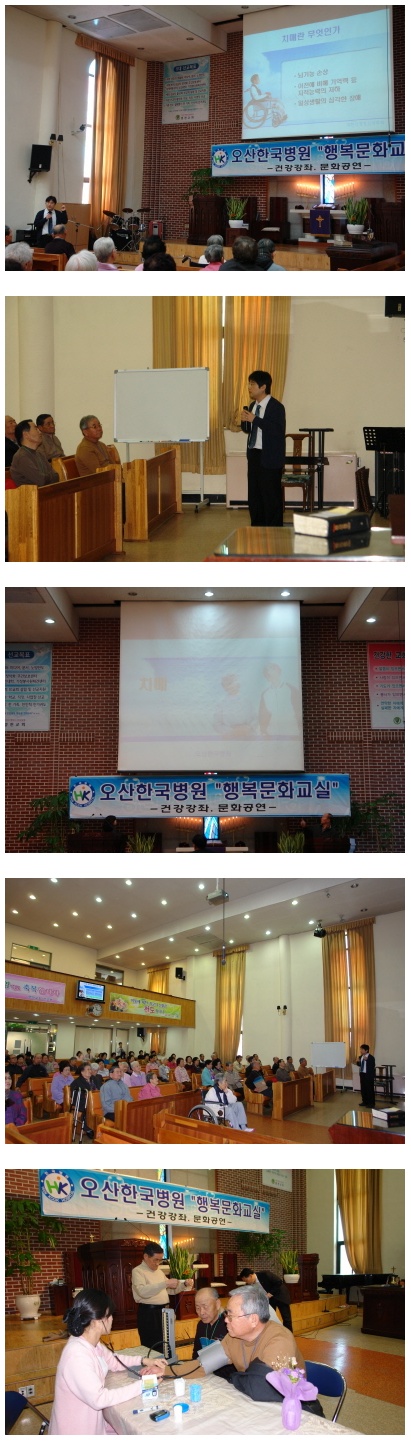 이번 행사는 영천교회에서 주관하는 노인대학 프로그램중 일환으로 초청되어 노인성 치매에 대한 건강강좌를 진행했습니다. 신경정신과 윤재항 과장님이 강의를 맡아 수고하셨으며 강의를 마친후 노인분들을 위해 혈압수치측정과 혈당체크를 하는등 의료봉사활동을 무사히 마쳤습니다.
