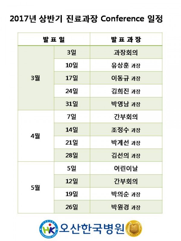 2017년 진료과장 Conference 상반기 일정 페이지 정보 작성자 오산한국병원 작성일17-02-15 09:40 조회29,469회 댓글0건 관련링크 이전글 다음글 목록 본문 본원 진료부는 향후에도 병원의 활성화를 위해 앞장 서 노력할 뿐만 아니라 의료서비스 및 질환을 연구하는 분위기를 조성하고자 아래와 같이 컨퍼런스를 진행합니다. 각 진료과장들의 적극적인 참여와 참석 부탁드립니다. 댓글목록 등록된 댓글이 없습니다. 이전글 다음글 목록