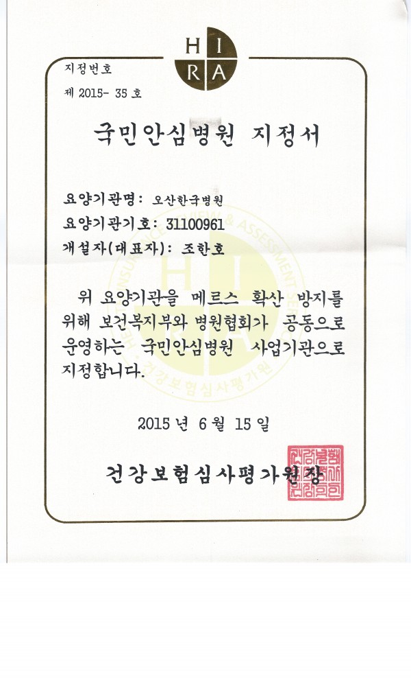 오산한국병원은 국민안심병원으로 메르스 감염관리와 예방진료로 메르스로부터 안전한 병원,
