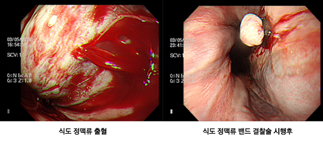 간 질환이 있는 일부 환자들은 식도, 위, 직장에 큰 정맥류가 생겨, 이곳에서 출혈이 발생할 수 있습니다. 이러한 경우 내시경을 통해 가는 바늘을 찔러 지혈제를 투여(경화요법)하거나 정맥류를 고무밴드로 묶어 지혈(결찰요법) 시키는데, 계속적인 내시경 치료로 식도, 위, 직장 정맥류를 완전히 치료할 수도 있습니다.