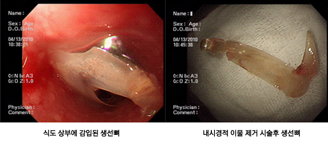 환자가 생선뼈나 동전, 건전지 등 여러 이물질을 고의 또는 사고로 삼켜서 응급실에 내원한 경우에는 위, 식도 점막의 손상 및 천공, 호흡부전 등의 위험성이 있기 때문에 응급 내시경을 시행하여 내시경을 통해 이물질을 체외로 배출시킬 수 있습니다.