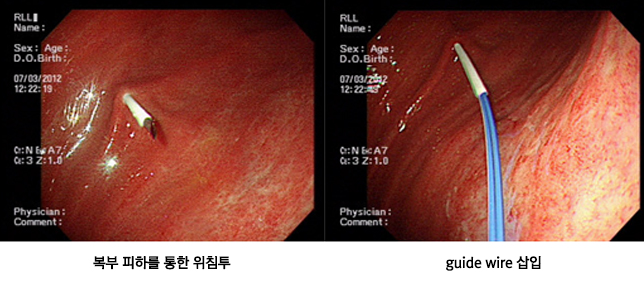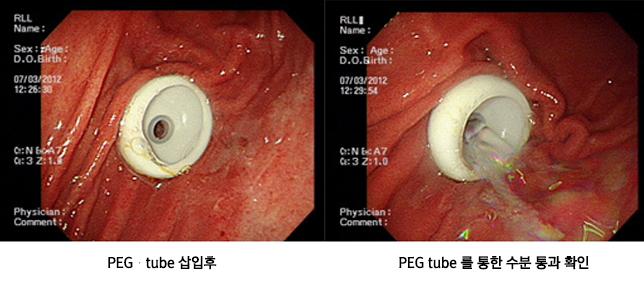 뇌졸증이나 뇌출혈 등으로 경구 섭취가 불가능한 경우 대부분 체외 삽입관을 통해 식사를 공급하게 되는데 코를 통한 경비적 위관 삽입술은 장기간 유치시 기관지로 음식물이 흡입되어 폐렴 등을 유발시킬 수 있으며 관 자체로 인한 점막손상 및 출혈을 유발시킬 수 있습니다. 그러므로 이러한 경우에는 경피적 위루술(복벽의 피부를 뚫고 위로 음식공급용 튜브를 삽입하는 시술)을 시행하는데 과거 위루술은 전신마취를 통해 외과적 수술을 시행하였으나 최근에는 내시경을 통해 전신마취의 위험이 없이 위루술을 시행하고 있습니다.