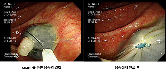 양성 종양은 과거에는 관찰 또는 수술적 절제를 하였으나 최근에는 너무 크지 않은 경우 내시경적으로 출혈 없이 간단히 제거할 수 있으며 이것은 치료적인 측면 뿐만 아니라 종양 전체 조직을 검사할 수 있어 정확한 진단에도 매우 도움이 됩니다.