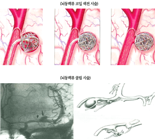 일단 뇌컴퓨터 단층촬영(CT)을 시행 후 뇌지주막하 소견이 보이면 뇌혈관촬영을 시행해야합니다. 뇌혈관 촬영상 출혈된 부위를 확인한 후 일단 의료코일이나 겔을 이용해 터진부위를 막아보고 여의치 않으면 수술을 통해 풍선꽈리를 클립을 이용해 막아주어야 합니다. 이때 수술을 하지 않으면 거의 재출혈로 사망하게 됩니다.