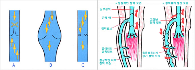 일방통행 밸브가 망가져 심장으로 일부의 피가 가기는 하지만 대부분의 혈류가 망가진 밸브를 통해 다시 다리로 내려와 정맥혈관이 계속 커지고 부풀게 되어 정맥류를 형성한다.
