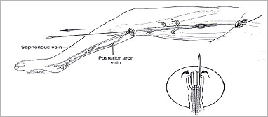 무릎 또는 발목에 절개창을 통하여 병변이 있는 정맥 내로 기다란 스트립퍼(와이어)를 서혜부까지 밀어 넣고, 그 부위에 절개를 하여 정맥을 스트립퍼에 고정시킨 후 서혜부쪽으로 잡아당기면서 정맥을 절제하는 과정을 보여주는 도식 각각의 확장된 정맥류는 정맥절제술로 제거한다.