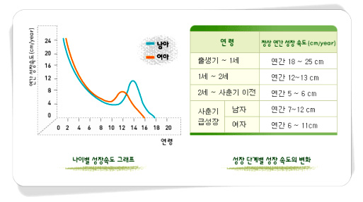 아이의 성장은 출생 이후 성장속도에 따라 4시기로 나눌 수 있는데 출생부터 2세까지와 사춘기에 급속하게 자라게 됩니다. 키는 체중과는 달리 사춘기 전후의 급성장기를 지나면 더 이상 자라지 않기 때문에 정상적으로 자라고 있는지 알기 위해서 연간 성장 속도를 확인하고 또래 아이들의 키와 비교해봐야 하며, 적정한 시기에 골연령 및 성장판의 상태를 확인할 필요가 있습니다.