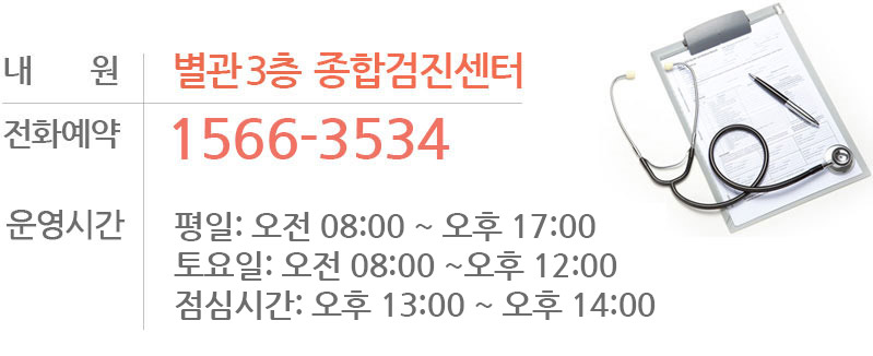 하반기(10월 ~ 12월)는 연말건강검진 시기라 검진대상자들이 많이 오시는 관계로 미리 전화 예약 및 문의 후 내원 하시길 바라며, 오전에는 검진 결과 상담으로 전화 연결이 어려울 수도 있사오니오후에 전화 예약 및 안내 받으신 후 내원 하시길 바랍니다.